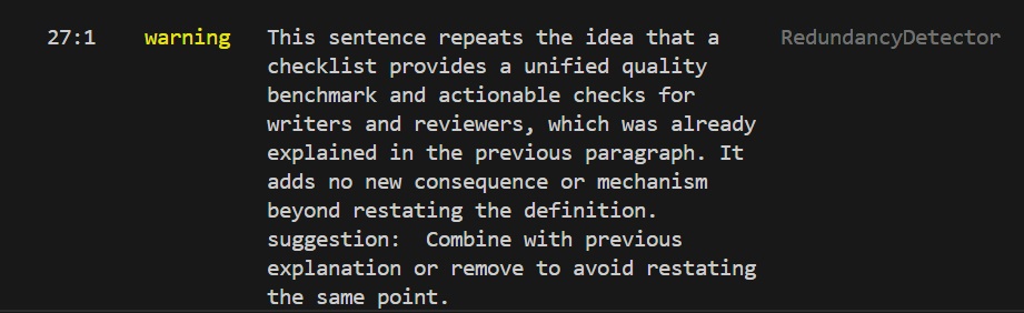 For example, if your checklist includes “Avoid unnecessary repetition that doesn’t add value,” you can create a VectorLint rule that detects redundant phrases and explanations. The rule flags content where points are repeated without adding new information.